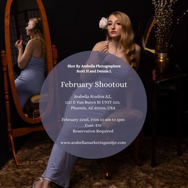 Join us for our Feb Shootout at Arabella Studios. You can shoot in any style that you like. Open to Talent and Business to get marketing photos. Shoot does not include hair and makeup.